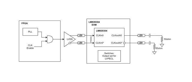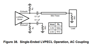 另一个问题是、在交流耦合之前、LMK00304输出上是否有接地电阻? LVPECL 驱动器通常需要发射极电阻器来为输出驱动器的发射极跟随器级提供直流偏置。 如果缺少这些电阻器、则输出可能不按预期运行。 在数据表中、看起来我们建议使用160欧姆: