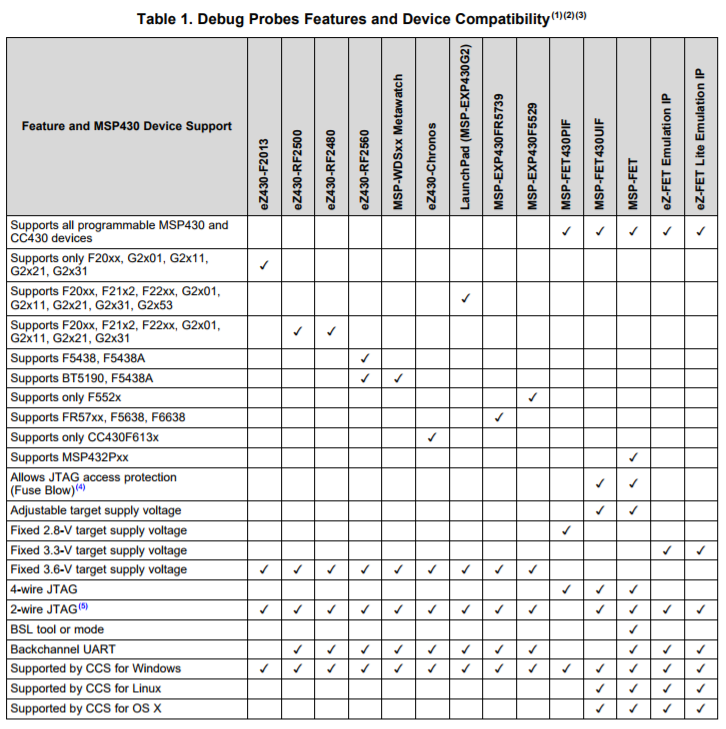我已经检查过其他人使用了MSP Launchpad或CC1310,但我似乎找不到任何人专门使用MSP-FET闪存仿真工具来执行类似的操作。 我查看了设备的数据表,并找到以下兼容性设备表: