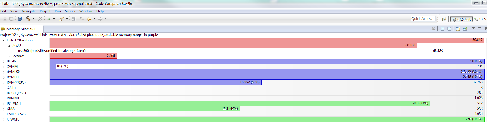 如果我比较两个内存分配视图, 基于TI C++ 6.4 .................................................................11 (图像1)和 TI C++ 15.12 >3 LTS (图像2)我在原始项目中看到TI库"rts2800_fpu32.lib"在多个函数中被分割,并且目标文件位于不同的内存部分。 在新编译的项目上, “rts2800_fpu32.lib”似乎被处理为单片代码块,因此无法将其放入RAM内存中。