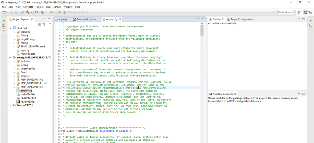 我创建了两个独立的RTOS项目: TM4C123G项目和MSP432项目。 这两种产品都有预配置的.cfg文件,但是,当我尝试使用图形界面配置它们时,“大纲”和“可用产品”视图为空: