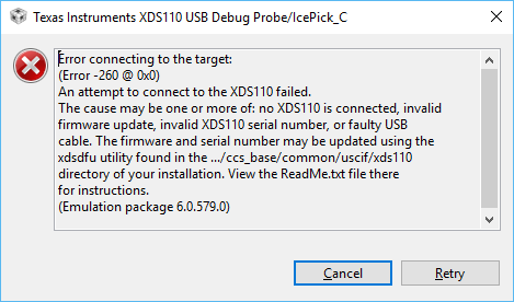 这两个板具有以下ID: "XDS-L100.1299万"和"XDS-L100.0383万"。 我尝试通过连接两个主板来输入其中一个,但CCS而不是刻录给出了以下错误信息: