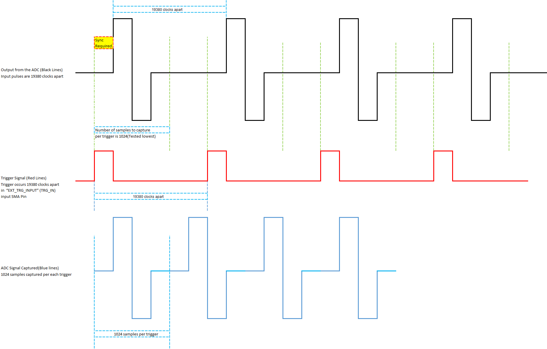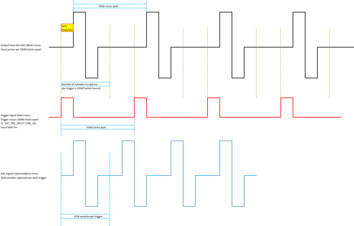 我们观察到、ADC 捕获的脉冲(计算公式如下)与给出给 SMA 引脚的触发脉冲之间的时间周期彼此接近。 我们认为、这两个信号必须正确同步、以便触发脉冲恰好在输入脉冲之前发生。 除此之外,我们没有看到任何明显的问题。
