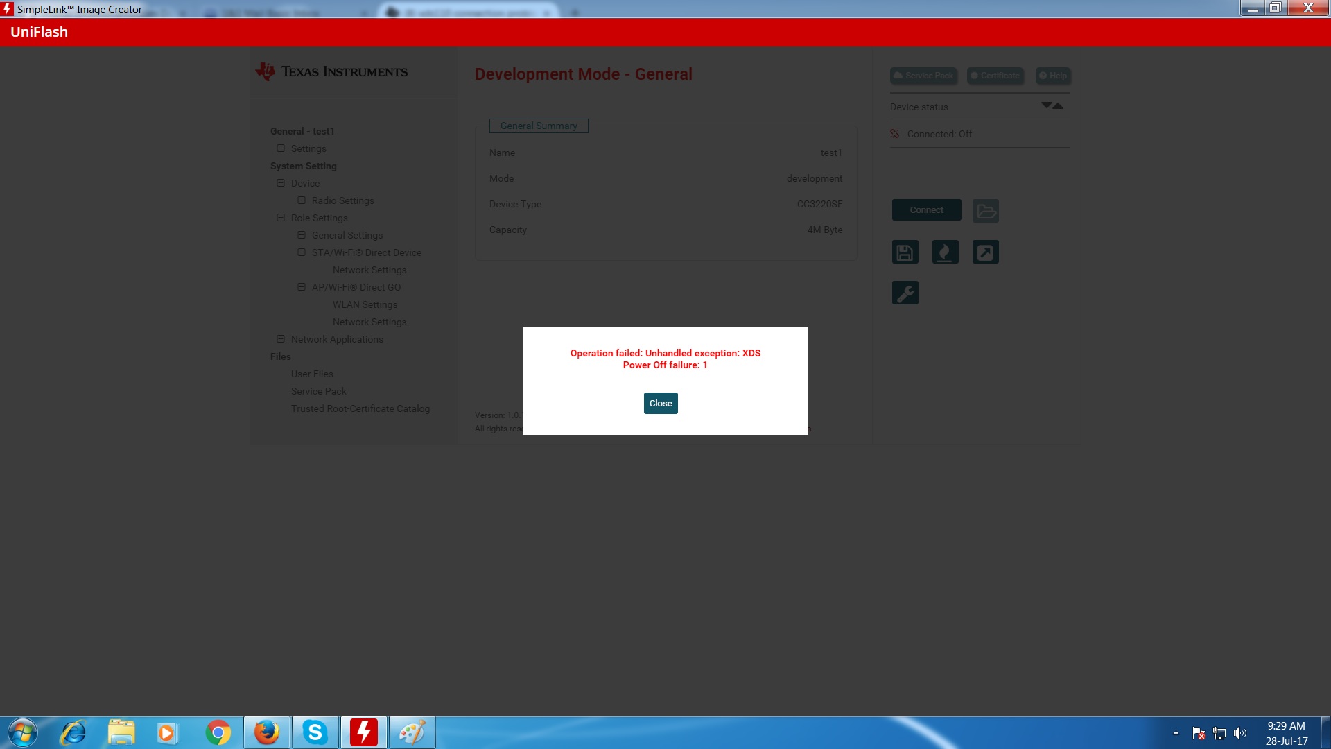 我按照连接 cc3320sf Launchpad 的步骤操作、但当我单击连接按钮时、它不连接。 它会将我的消息显示为"操作失败:未处理异常:XDS 关闭失败:1"。 我将 SOP 连接设置为010。