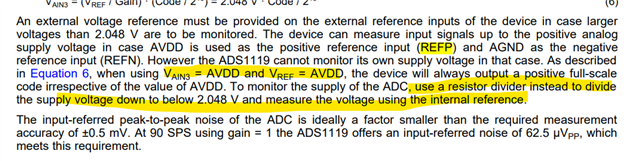 您在此处所指的声明仅适用于测量 ADC 的电源电压(AVDD)。 在这种情况下、您需要使用2.048V 内部基准、因此输入信号必须小于2.048V。 您可以使用电阻分压器来完成此操作