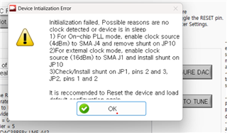 我购买了 DAC38RF82 (TSW14J50)、并使用内部 GUI 时钟对其进行测试、但出现以下错误。 问题是什么?
