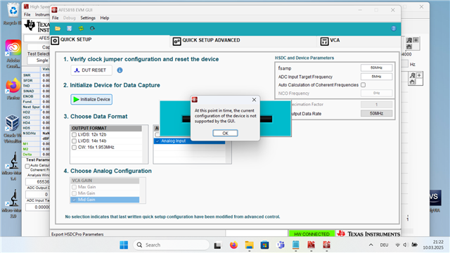 [参考译文] AFE5818EVM:使用 TSW1400EVM 时多个错误-数据采集无法工作