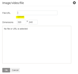 从下面的菜单中选择 Insert (插入)-> Image (图像)/Video (视频)/File (文件)。 然后单击"上传"按钮(即使它是灰色的)、这将允许您附加文件