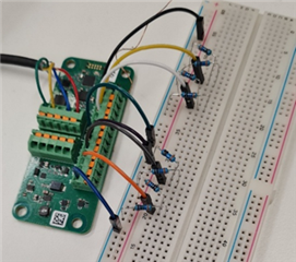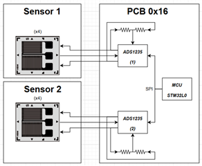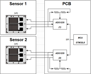 该系统设计用于监测位于机器不同部分的两个钢物体的变形情况。 每个钢质物体都配备了四个应变仪(配置为半惠斯通桥)、总共八个应变仪。 这些电量计(350 Ω 的标称电阻、在半桥配置中约为700 Ω)是根据用作基准的 PCB 安装式分压器(包含两个1kΩ 电阻器)进行测量的。