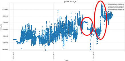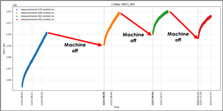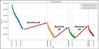 为了消除机械影响、将器件放置在机器上、而无需将传感器焊接到任何结构。 结果仍然显示出陡峭的漂移(正或负)、并在下电上电时发生变化: