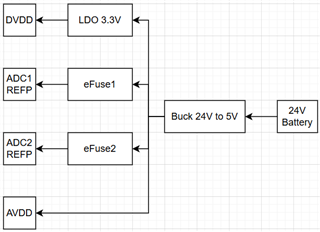 - 此评估板由24V 电池通过降压转换器供电。 尽管降压转换器的输出电压随着输入电压的变化而有一些变化、但由于差分测量、它对 ADC 读数的影响很小。