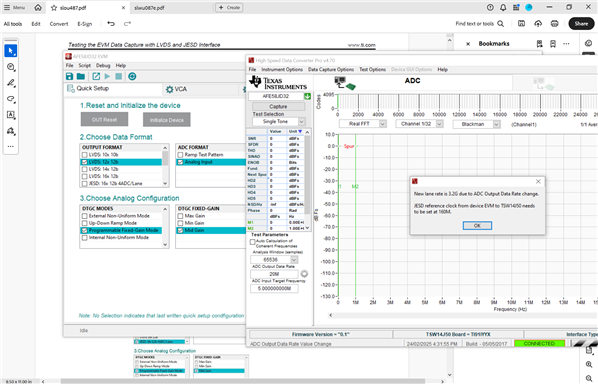当我根据文档"slou487 4.2.2 - 5. "弹出一个窗口、如随附图像所示、其中显示"从器件 EVM 到 TSW14J50的 JESD 参考时钟需要设置为160M"-此160M 与 "slou487 4.2.2 - 1. "? 如果是这种情况、我将在 J56上提供160MHz +13dBm 的正弦信号、并获得下图所示的误差: