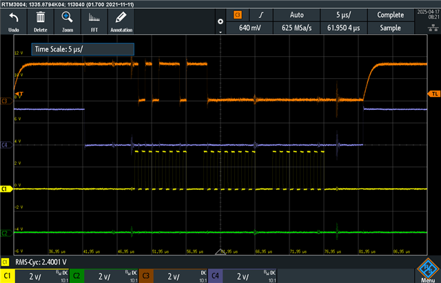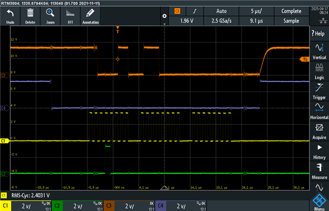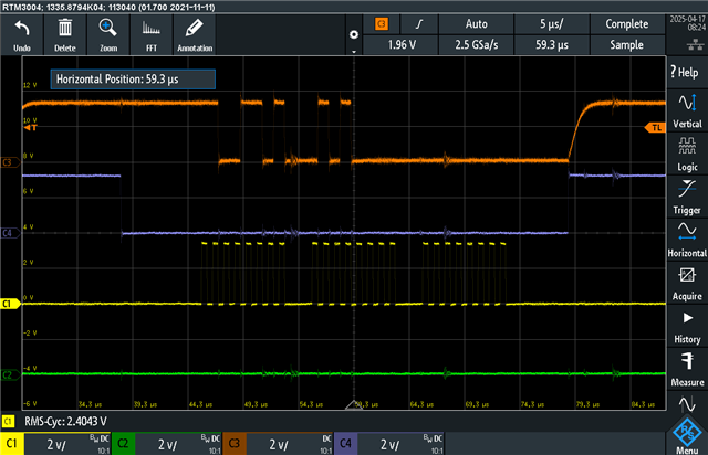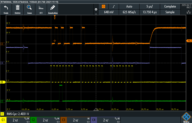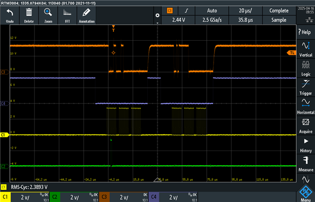 在这些图片中、会针对 系统状态寄存器发送寄存器读取命令。 但从图中可以看出、从 ADS7028接收到的数据会针对每条消息而发生变化。