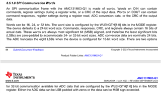 大家好、我的怀疑是、在 AMC131M03中、它将在从 MCU 读取期间发送5个字的数据。 因为 im 使用24位数据长度。 3个 ADC 数据将为24位。 我想确认,当数据长度寄存器配置为24位时,第1和第5个字、响应和 CRC 也将以24位的形式出现。 或者是16位数据。