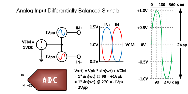模拟输入共模或 VCM 为1.5V。 因此、模拟输入满量程为2Vpp 差分。 这意味着差分两侧的摆幅为0.5V、约为1.5V。
