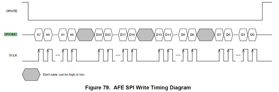 在写入模式下、连接的 MCU 将 SPISTE 置为低电平 、并在 SPISIMO 引脚上发送带有同步数据位的 SCLK。 在这里、MCU 是 SCLK 发送器、AFE4490是 SCLK 接收器。