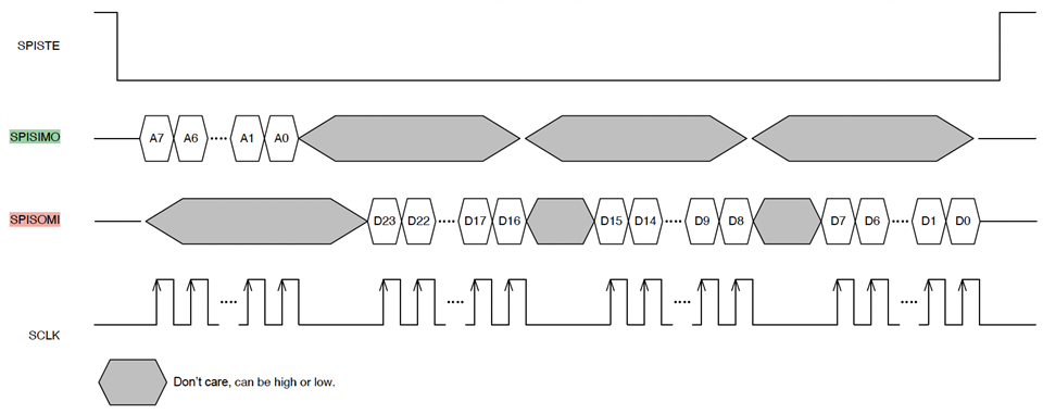 在其 读取 模式下、MCU 需要在地址 A7至 A0?的前8位之后将其 SCLK 引脚的作用交换为接收器。如果不是、MCU 是否可以继续发送 SCLK 并检查 SPISOMI 引脚的状态? 同样、MCU 可以忽略 图80中描述的中断。