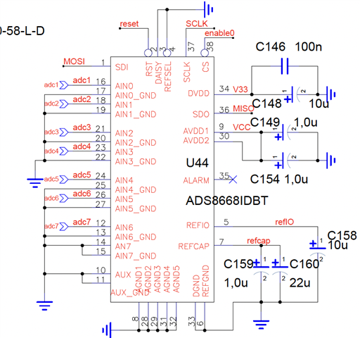 如上面的原理图所示、ADC 4的输入信号引脚 AIN4标记为引脚编号。 引脚24、而相应的 GND 引脚被标记为引脚编号25。 这些是反转的(问题是在 hoc 该工程从头创建 ADS8668的 AD-ADS8668符号时引入的)。 通道5也有同样的问题。