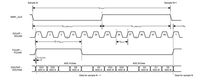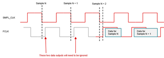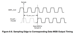 SMPL_CLK 开始转换、但在  24位数据帧中、转换的数据读取将有一定的延迟~2 x tSMPL_CLK、如图6-8 (第14页)所示。 这意味着在周期 N+2中 FCLK 的上升沿之前、周期 N 上开始的转换数据不会输出。