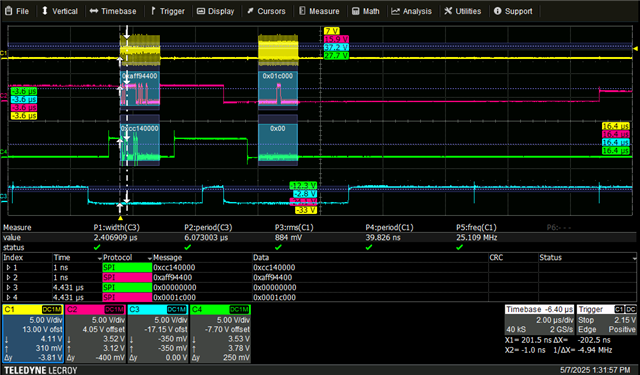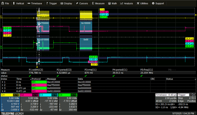 第二点、从我的角度来看、这也与数据表中的说明不对应、如果您已在 DATAOUT_CTL_REG 中激活了奇偶校验位、读取期间还会附加奇偶校验位、而数据表中指出16位数据用于半字读取、其余响应都是0。