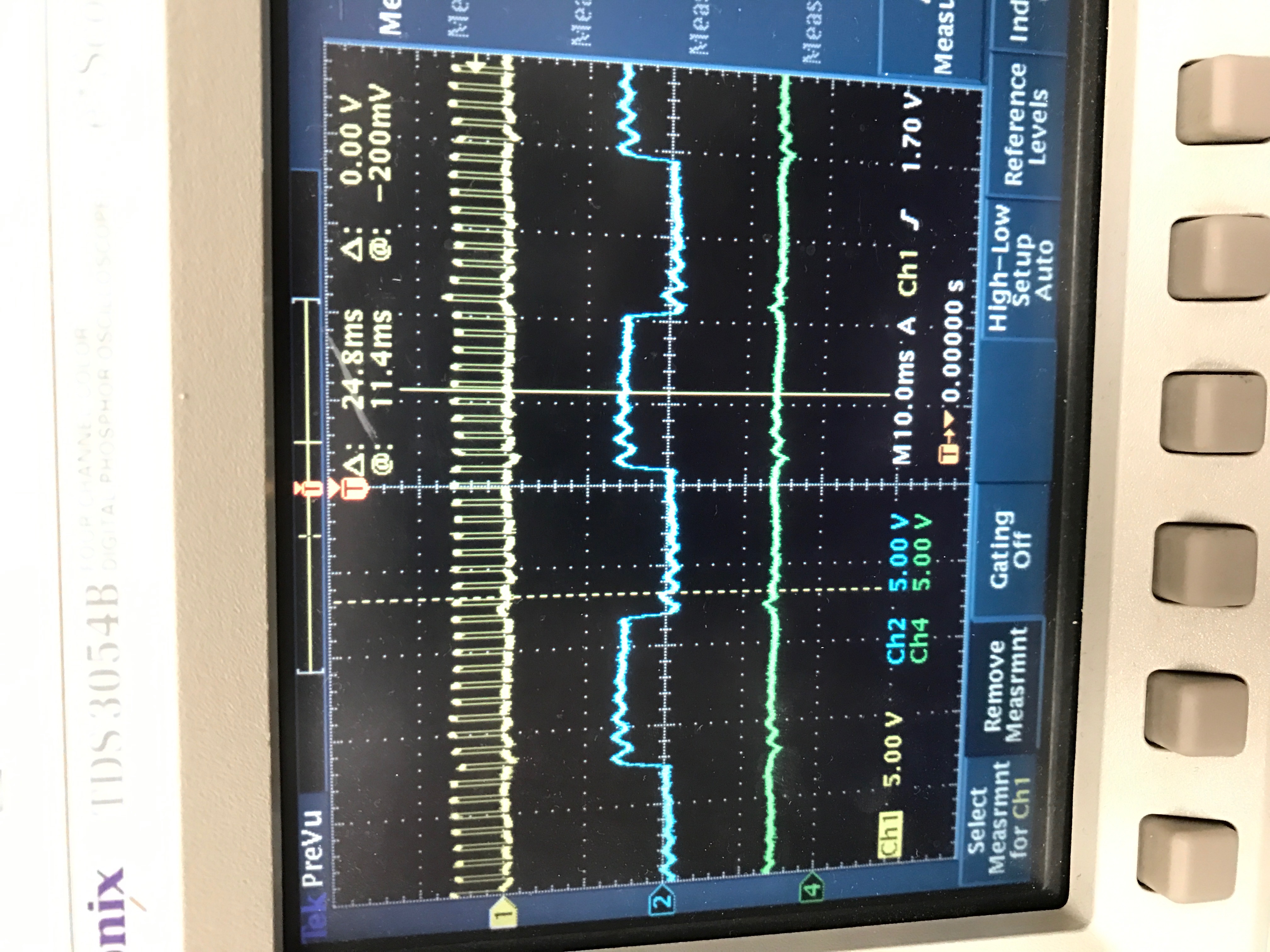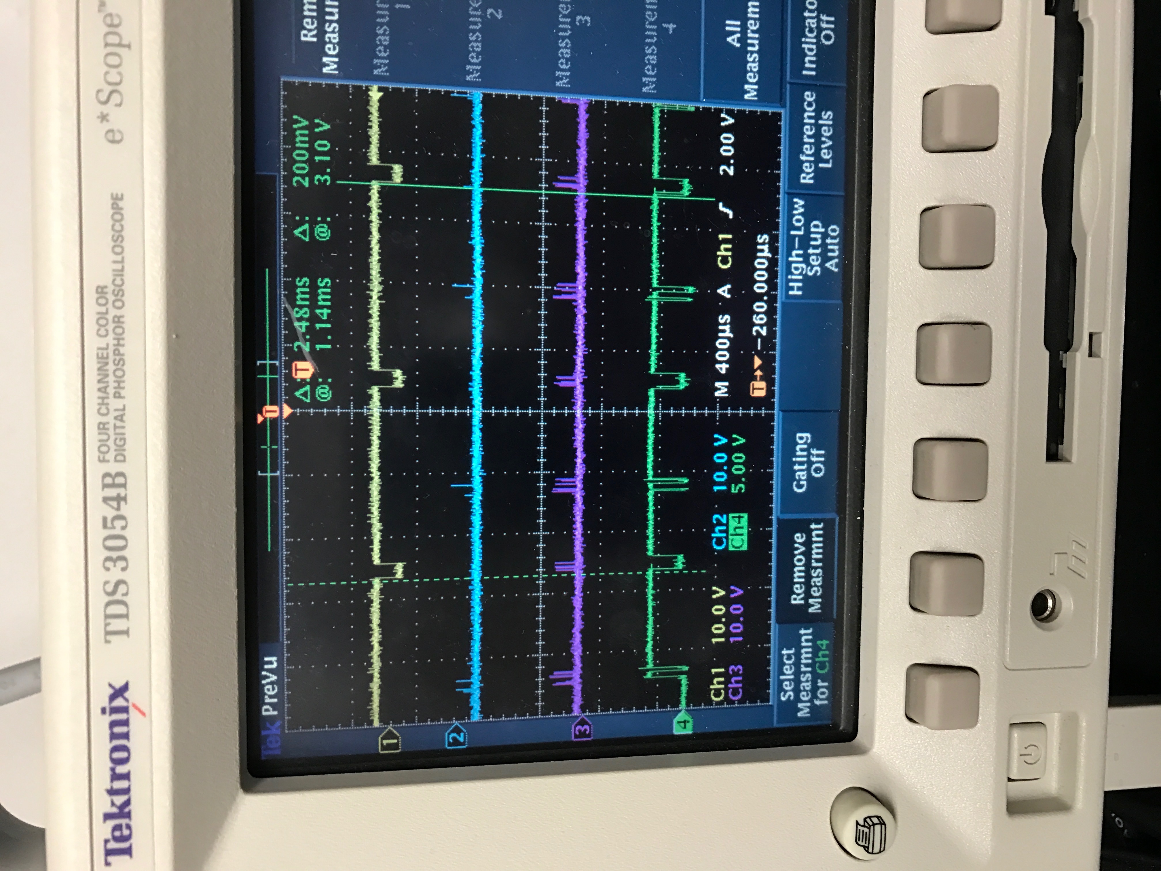 对于第二个示波器捕获,黄色曲线为CS,蓝色为DIN,紫色为SCLK,绿色为DOUT。