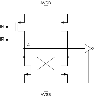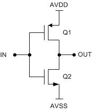 但是,如果在停留时间接近中点,则Q1和Q2都将打开,从而允许电流从AVDD流向AVSS。 这将消耗额外的电源电流,直至所有电源均逐渐接近最终值。 当输入信号来自数字电平转换且接近DGND时,可能会出现这种情况。 此信号对于数字侧可能较低,但会导致逆变器接近中点。