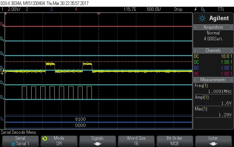 我想你忘记了通过R4探测发送你所得到的图像。 我所说的高阻抗是理想情况下,没有电流从SDO流出。 SDO应连接到主机上的高阻抗输入。 如果它连接到非高阻抗的其他设备,则可能会拖慢SDO的电压。 通过R4探测可以测量电流(测量的电压/R4电阻),以查看SDO的电流消耗是否超过正常电流。