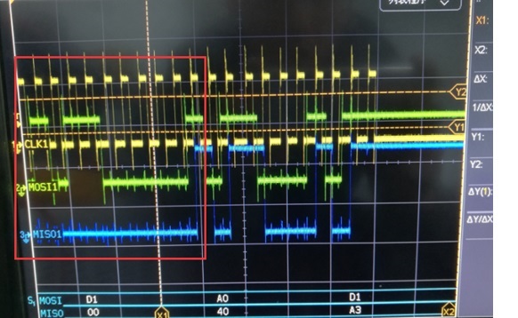 软件配置:发送 0xC0CBC0CB (使用带有配置寄存器回读的32位数据传输周期,请检查以下波形,32位的前半部分为数据(零),后半部分为回读配置寄存器设置)。