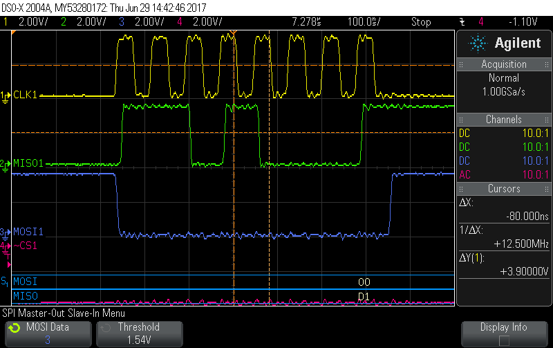 此外,通过6MHz SCLK和更低的速度,我可以从ADS131E06获得可靠的数据。 使用SCLK 12MHz+时,DOUT上的数据似乎发生了偏移,因此它与SCLK的下降而不是其应有的上升边缘同步。 这是否可以是与SPI引脚电容交互的100欧姆系列电阻器的相移? 这似乎不太可能,因为我预计SPI引脚电容为几pF。数据表P12显示SPI设置为CPOl=0-和CPHA=1。 这是错了吗?
