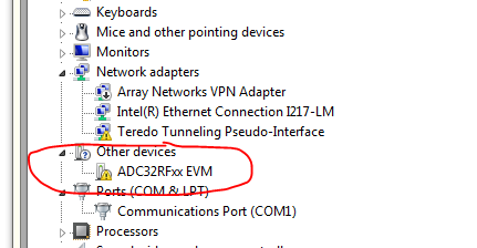我安装了ADC32RF45EVM GUI文件,但由于某种原因,当我检查“设备管理器”时,它会将该板显示为无法识别。 我使用的是Windows 7 64位SP1。 我尝试重新卸载并重新安装,但没有任何区别。 我不知道如何从这里着手。 我在网上找了一个司机,但是找不到。
