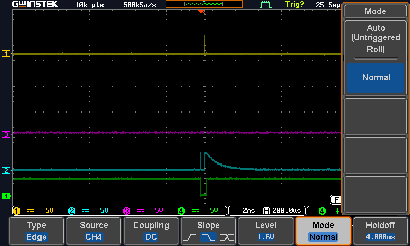 所以我在DSO上得到的是非常奇怪的,因为它似乎正在放电(DSO上的DOUT PIN)