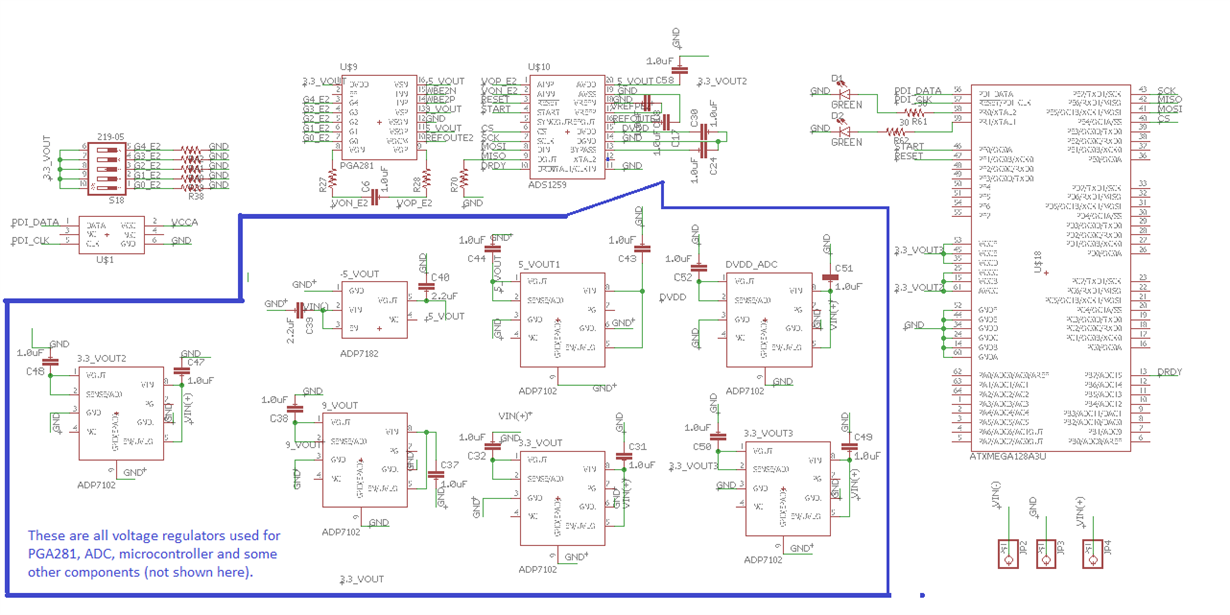 我正在为我的项目使用ADS1259 A/D转换器来转换从PGA281接收到的数据。 用于与ADS1259进行SPI通信的微控制器是ATxmega128a3u。 在过去的两周里,我一直在尝试配置ADS1259寄存器,以便将默认采样率从10SPS切为3600 SPS,并进行一些其它设置,但似乎没有正确写入寄存器。 /DRDY引脚在10SPS时始终保持高和低。 我还尝试通过检测RREG命令来读取寄存器值,但始终获得0x00值。 我知道人们也在早些时候提出了类似的问题,但是,即使在尝试了这些解决方案(例如,将SPI模式更改为模式1,首先发送SDATA命令以停止"读取连续数据"模式)之后,我也没有成功。 我在下面附上了我的代码和原理图。