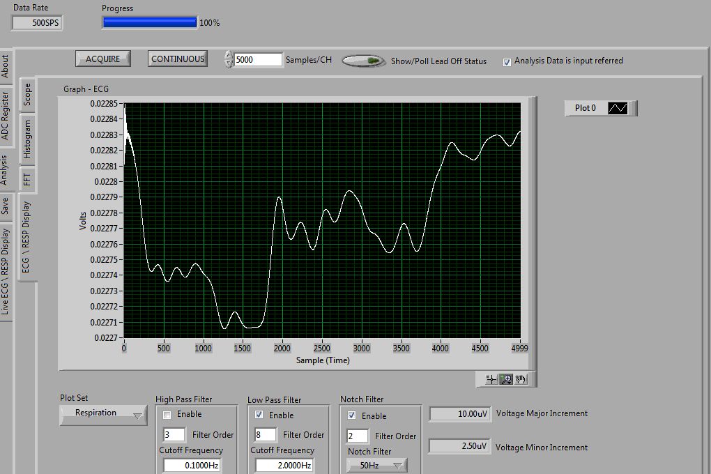 另外,请记住呼吸频率通常在0.2 Hz至0.5 Hz范围内。 在第二幅图像中,您可以看到样本~1900和~4000之间的一个呼吸周期,在500 SPS时,这相当于约0.24 Hz。 您可能需要记录更多的样本,以便在低通滤波器稳定后可以看到多个呼吸周期。