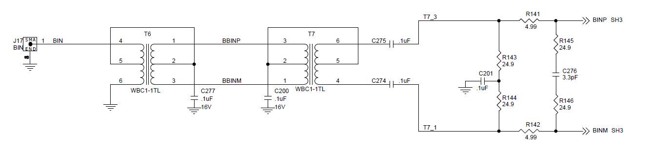 如上所述,我计划直接 从接头获得IF差分信号。 我相信连接器将具有100欧姆差分阻抗。 如果我将R5,R3,R63和R101更改为~50ohm以匹配100ohm差分,这样做是否可以在不降低或损失全尺度功率的情况下为ADC供电? 或者,ADC希望看到50欧姆差分的全尺度电阻,因此需要阻抗固化吗? 如果此更改正常,如果需要的不是3.3pF,您还可以推荐C3值吗?