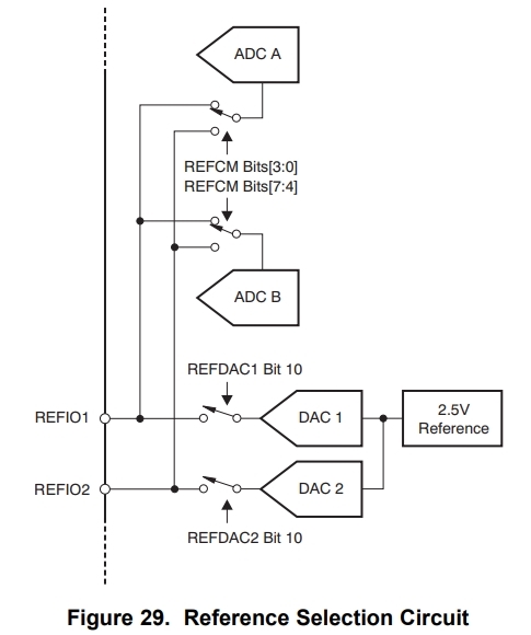 REFIOx引脚是设备的参考输入或输出。  在默认设置中,内部引用被禁用。  在这种情况下,设备要求客户在REFIO处应用外部参考。  外部参考输入电压范围为0.5V至2.525V 。此外,建议使用连接到RGND的22 UF陶瓷电容器;RGND需要使用专用VIA连接到PCB中的模拟接地平面。  确保外部参考电路能够驱动22uF旁路电容器和SAR ADC。