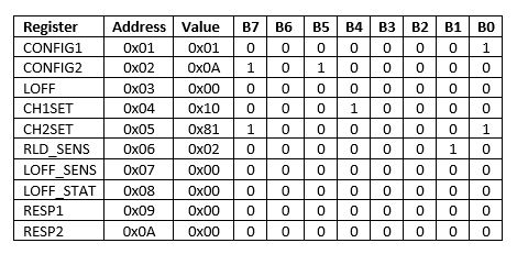 我认为问题与RLD放大器有关。 您正在使用RLD偏置输入,但它已关闭,因此输入共模电压是浮动的。 请只设置5个RLD_SENS寄存器并清除位1,即RLD_SENS = 0x20。