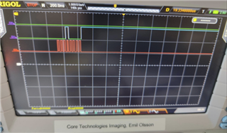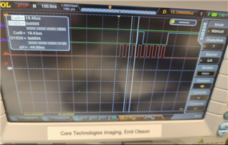 看看你的示波器镜头,我不确定第一张图片中的时间/刻度,因为它有点模糊。 是5 us/div吗? 您能澄清吗? 如果您能够明确CS引脚(CS下降边缘到CS下降边缘)的频率,这也会很有帮助。 如果您需要1MSPS,则CS下降边缘到CS下降边缘需要为1/吞吐量或1/(1MHz),即1us。