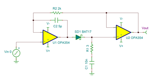 ADC 输入是一个脉冲信号、上升时间为10ns、下降时间为30ns。 我们将使用高速比较 器来区分脉冲信号的上升沿、然后将速度比较器的输出延迟一小段时间、以触发 ADC 对脉冲信号的最大电压进行采样。