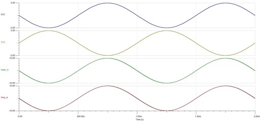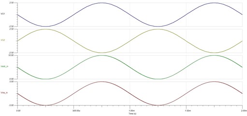 2.当仅+15V 电源施加到 INA828时、由于+15V 电源、您的输入信号应限制为差分+/-5V (Vina_in)。 当增益为1且偏置电压(Vref)为5V 时、INA828的输出为0~10V。  请参阅下面 TI-TINA 仿真的时序。  ADS8684的全动态范围(-10V~10V)仅用于一半(0~10V)。  仍然可以测量正信号和负信号、但 ADC 的实际分辨率仅为15位。 如果您希望支持-10V~10V 差分信号、INA828的单电源应高于20V。