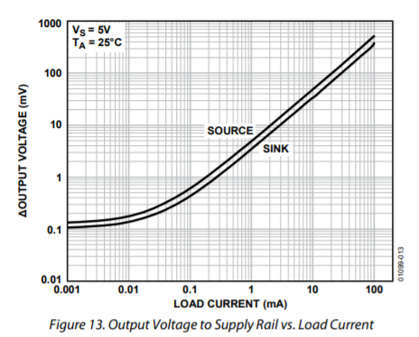 我还从 AD8531数据表中找到了该图、当负载电流达到100mA 时、从电源轨的电压摆幅看起来应该是几百 MVS。