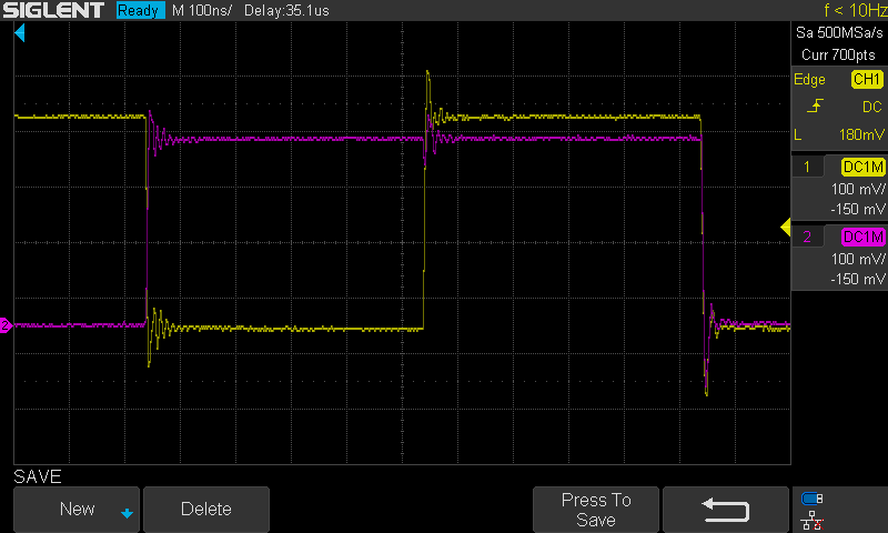 我是。 这里有几个。 这在使用模式0时在1MHz 上完成。 我的探针为10倍、输出降压150mV。 尽管频率较低、这些事务仍无法导致输出更新。