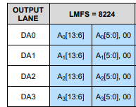如果您从每个 JESD 通道获取32位数据、则每个32位数据都有两个 ADC 样本。 四个通道中的这两个采样需要交错、以获得8个连续采样(使用所有四个通道的数据)。 在第一个通道的32位内、前16位包含 采样 A0后16位包含采样 A5。 同样、第二通道32位数据包含前16位和 A5等的采样 A1。