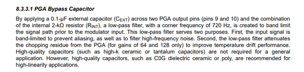 请注意、该电容有2种优势。 首先是转角频率为720Hz 的抗混叠滤波器、其次是滤除 PGA 斩波级的噪声。 如果未安装此电容器、这很可能是噪声太大的原因。