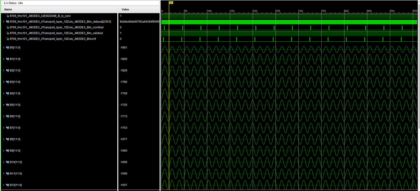 我正在根据 ADC12DJ3200EVM 的参考设计研发自己的硬件。 设置 LMK04828、LMX2582、ADC12DJ3200的顺序与 GUI 设置日志所示的顺序相同。 我已经测试了 PRBS7/15/23和斜坡测试以及传输层测试。 看起来都很好。 但正常运行时、我可以从通道 B 获取样本、而通道 A 看起来不正常。 顺便说一下、为了简化 PCB 布线、我将 DA0~DA7反相、但我已经为 JESD IP 设置了内部 RXPOLARITY=1。