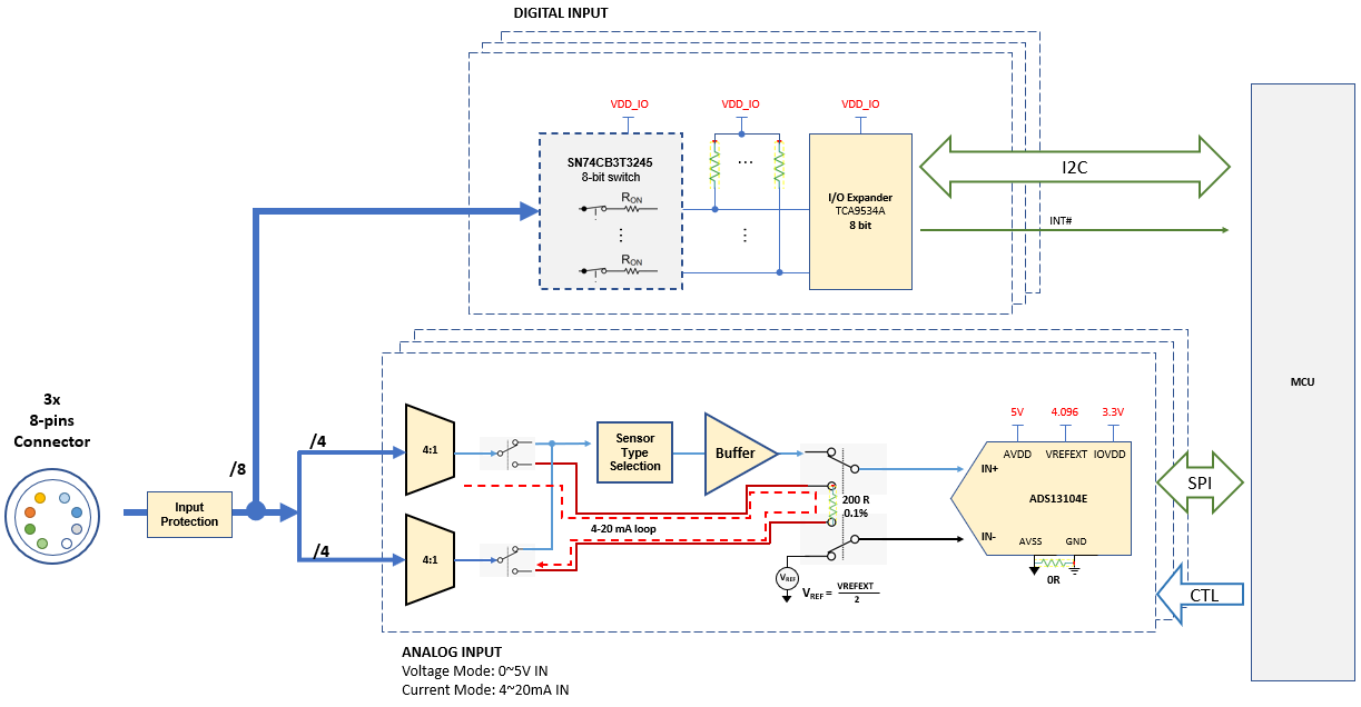 - 在 ADS131A04 (伪差分)对模拟信号(单端)进行采样和缓冲之前、模拟信号(单端)进行多路复用和缓冲