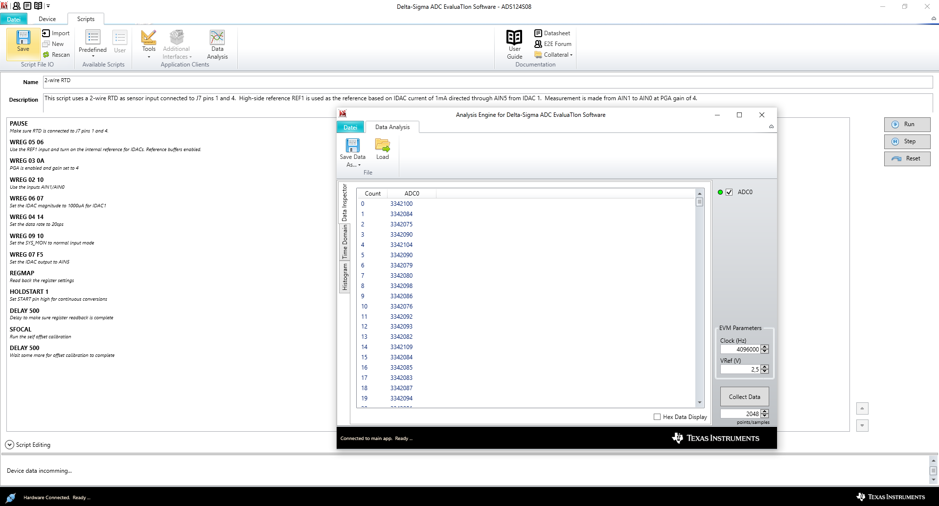 由于 EVM 可通过多种方式使用、因此 GUI 实现不具有直接转换到温度的功能。 您需要导出数据、然后将数据读取到电子表格中并在其中完成转换。 您将无法直接从 EVM GUI 读取温度。 计算方法与我在上面所说的类似。
