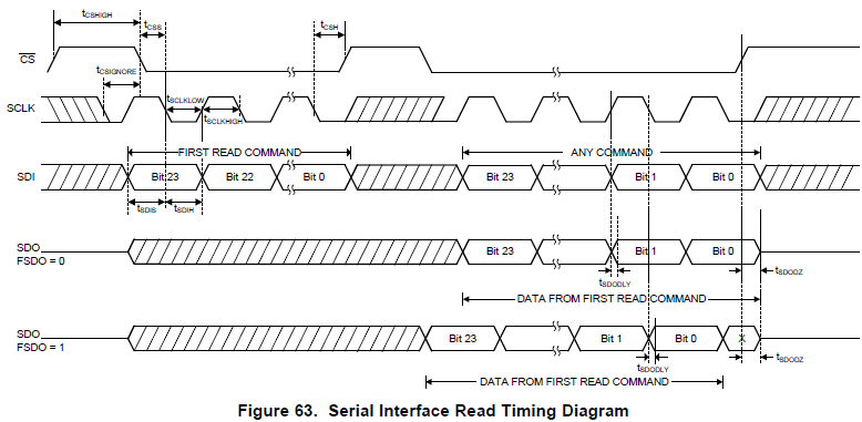 SBAS871C (2017年8月)数据表说明了图63中的读取时序、但未能通过 CS、SCLK 和读取位23的协调正确说明读取数据事务的开始。 在命令/数据事务对之间没有正确地说明 SCLK;我假设当 CS 在命令和数据事务中变为低电平时 SCLK 应该为高电平、但这并不清楚。 命令和数据之间没有说明 SDO 三态。 在 CS 高电平期间、SDO 是否会保持驱动? 如果 FDSO=1、读取位23是否显示(还是保持?) 在对命令位23进行采样的第一个下降时钟之后、CS 变为低电平并更改为位22?