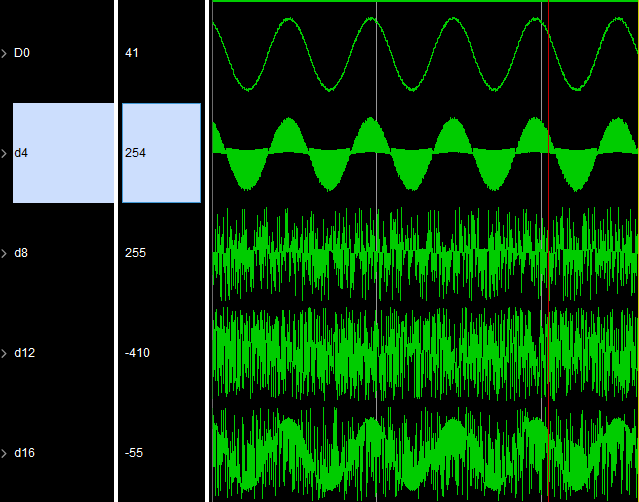 JMOD=1、 两个 RX 内核被用来接受来自 FPGA 中16个通道的数据。  我根据表28中的格式对所有数据进行排序、并绘制波形: