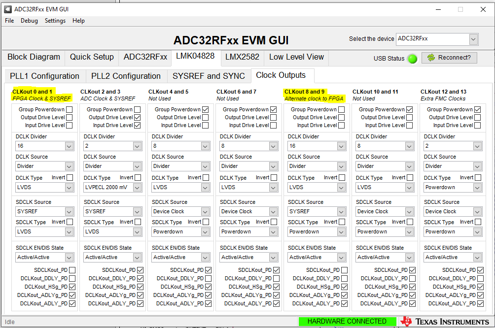 在 ADC32RF45EVM + TSW14J56EM 设置中、 不使用 CLK_LAO_0P/M 时钟。 因此、该时钟输出从 LMK04828禁用。 如果您在 FPGA 中使用此时钟和 SYSREF 对、并且想要配置与 LMK04828的'CLKOUT 0和1'类似的时钟和 SYSREF 对、请在  GUI 'LMK04828 ->时钟输出'选项卡中配置'CLKOUT 8和9'、与'CLKOUT 0和1'相同、如下面的 GUI 快照所示。