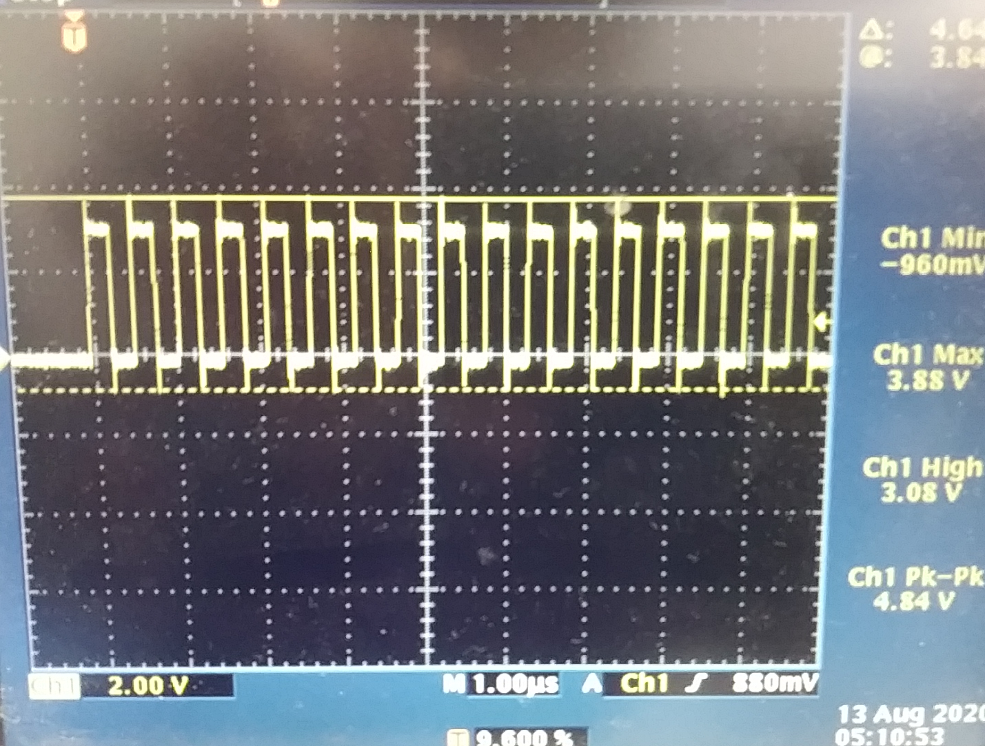 在当前设计中、ADS1248的行为非常不同–我们无法使用 SPI 总线与其进行通信。 SPI 信号上有一些振铃… (请参阅随附的图像)。   我需要数字来表示 SPI 信号上的最大尖峰振幅。