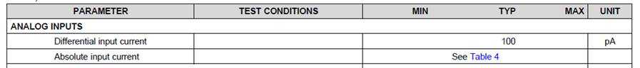 ADS1148数据表定义了模拟输入的绝对输入电流、如下表所示。